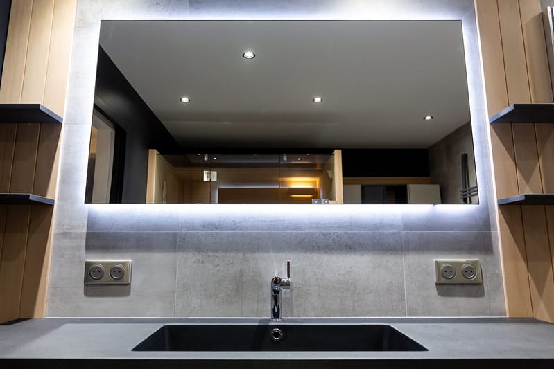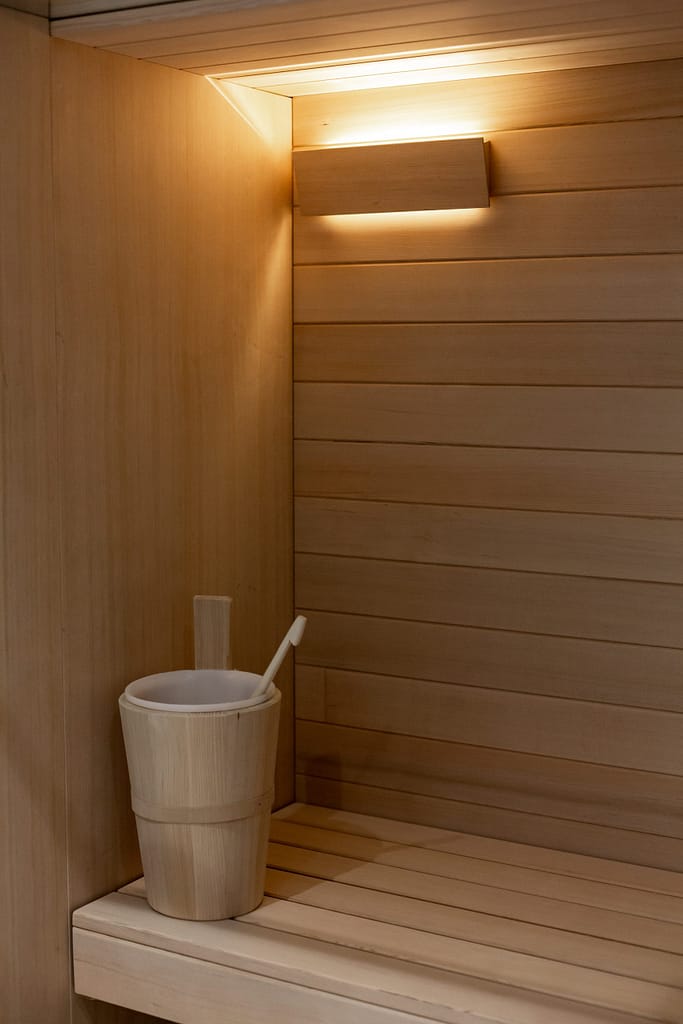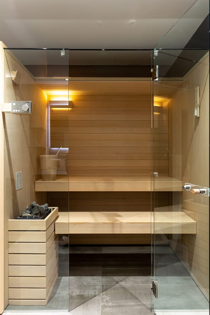 Pour une ambiance plus tamisée par contre, le miroir et la lumière du sauna en éclairage indirect seront vos guides.