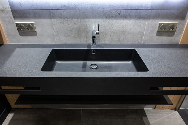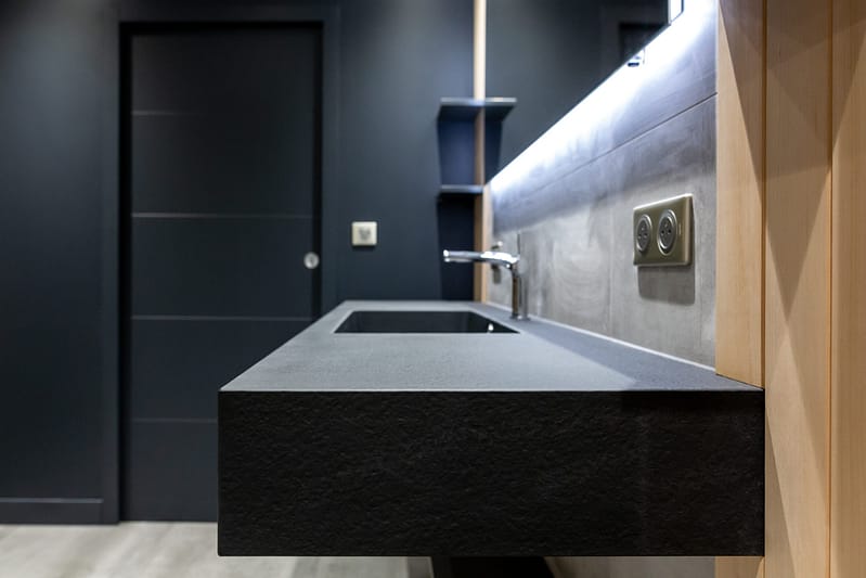 Le plan vasque et le receveur de douche de chez Arblu sont composés d’une résine anthracite. On adore le toucher de cet imprimé texturé, une matière ardoise comme pour rappeler les origines locales . Attardons-nous sur les détails de cette vasque suspendue conçue dans un monobloc. La vasque est moulée pour plus de pureté, des entailles symétriques pour les portes serviettes, comme une touche féminine dans cette ambiance masculine.