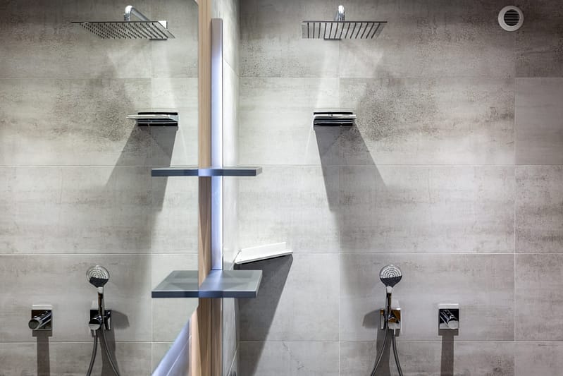 Son duo de couleurs reste indémodable. Le gris de la faïence se fond parfaitement dans les points anthracites de la pièce imposés par le sanitaire. On impose d’entrée le chic et l’exigence neutre du bien-être. Il suffit de se retourner pour remarquer que la porte coulissante se dissimule parfaitement dans le mur, comme pour fermer ce double sas idyllique.